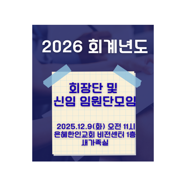 2026 회계년도에 새로운 임원진이 개편되어 회장단과 신임 임원단이함께 모여 교제하는 시간을 아래와 같은 일정으로 갖고자 합니다.교회 행사로 바쁘신 중이지만 오셔서 서로 격려하며 아름다운 친교를 나누시기 바랍니다.